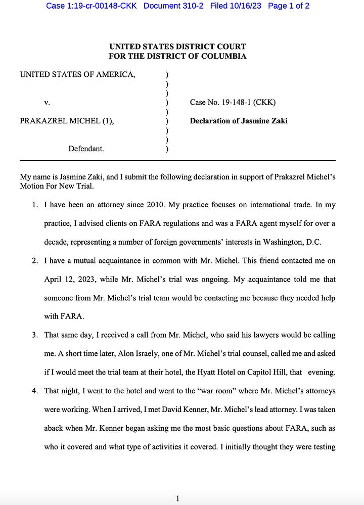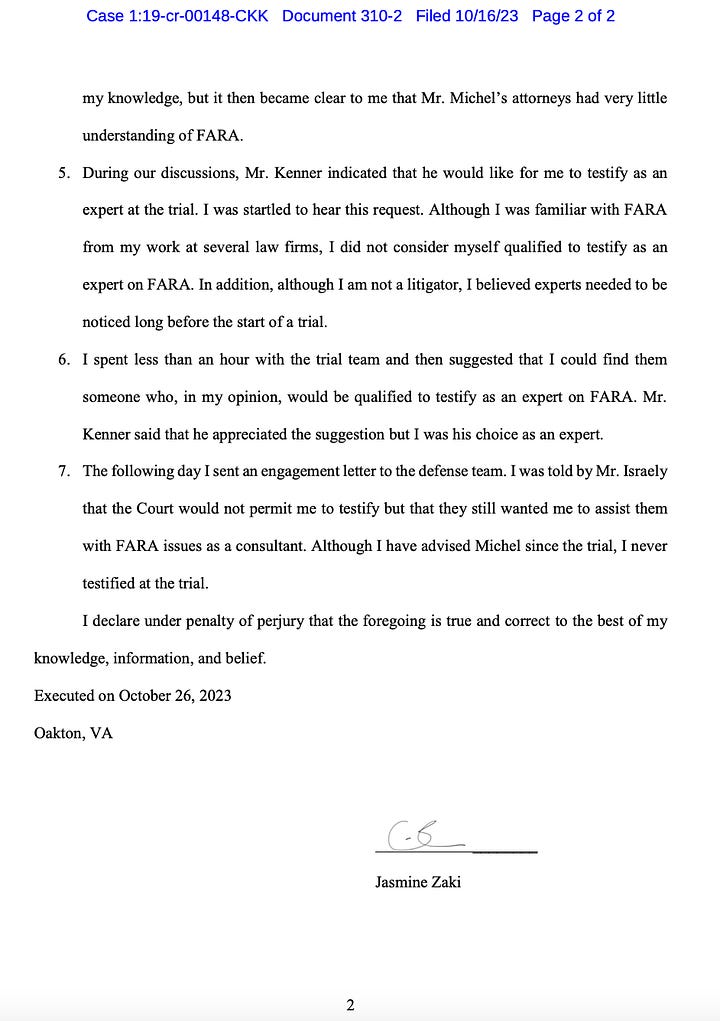 “I was taken aback when Mr. Kenner began asking me the most basic questions about FARA, such as who it covered and what type of activities it covered,” Zaki wrote. “I initially thought they were testing my knowledge, but it then became clear to me that Mr. Michel’s attorneys had very little understanding of FARA.”