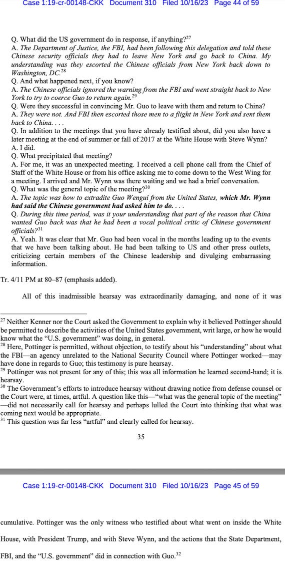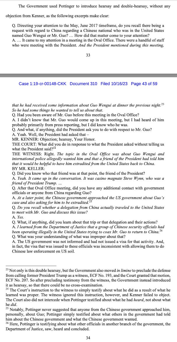 They also take issue with Kenner’s lack of objections for hearsay, which allowed a witness to testify “who provided evidence that the alleged lobbying scheme had reached inside the Trump administration, yet …. had virtually no first-hand knowledge of the information about which he testified.”