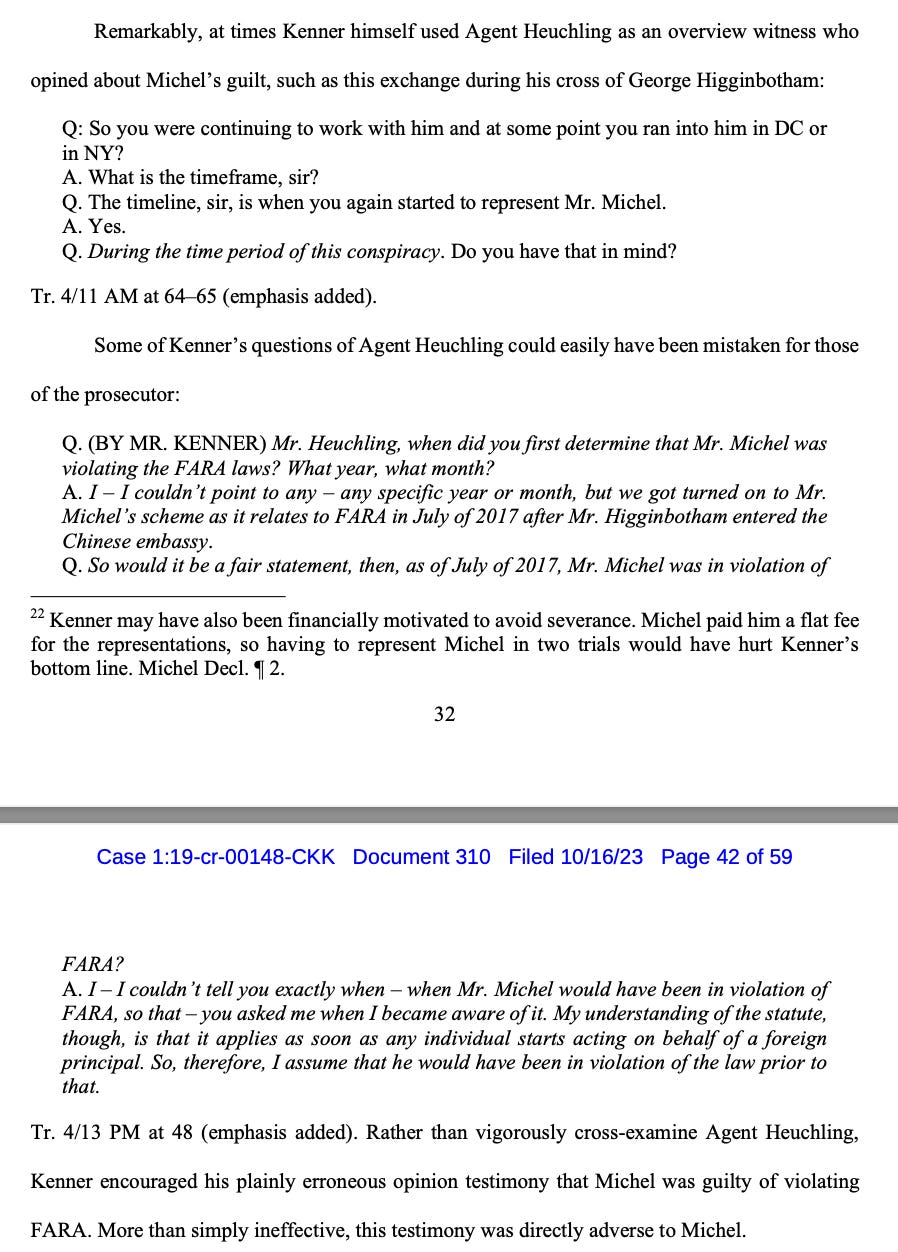 “That Kenner and the contract attorneys lacked white collar experience is evident from their strategy and work product,” Michel’s new lawyers wrote in a footnote. “For instance, the defense filed a motion to dismiss on the basis of an advice-of-counsel defense, ECF No. 132, even though any competent white-collar practitioner would know that the advice-of-counsel defense can only be raised at trial.”