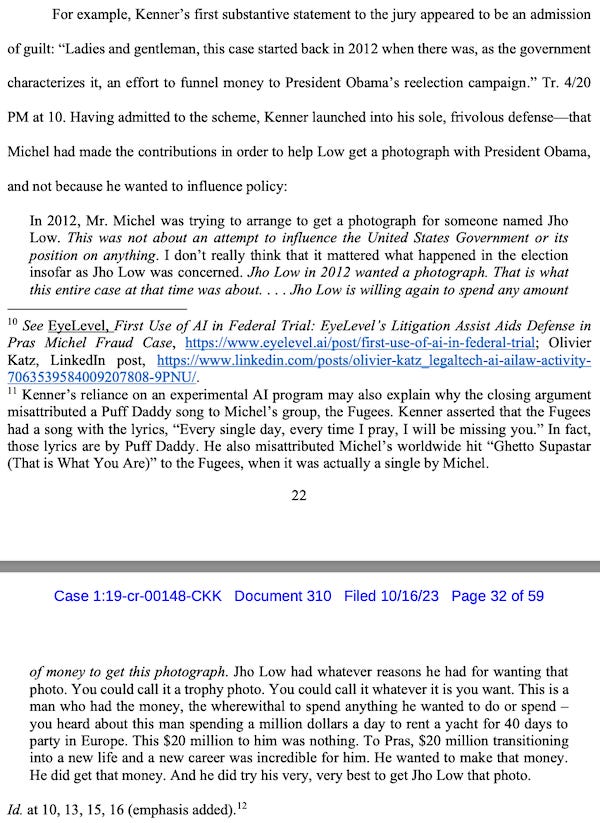 Kenner’s use of artificial intelligence for his closing argument is far from the biggest problem alleged in Michel’s motion for new trial.