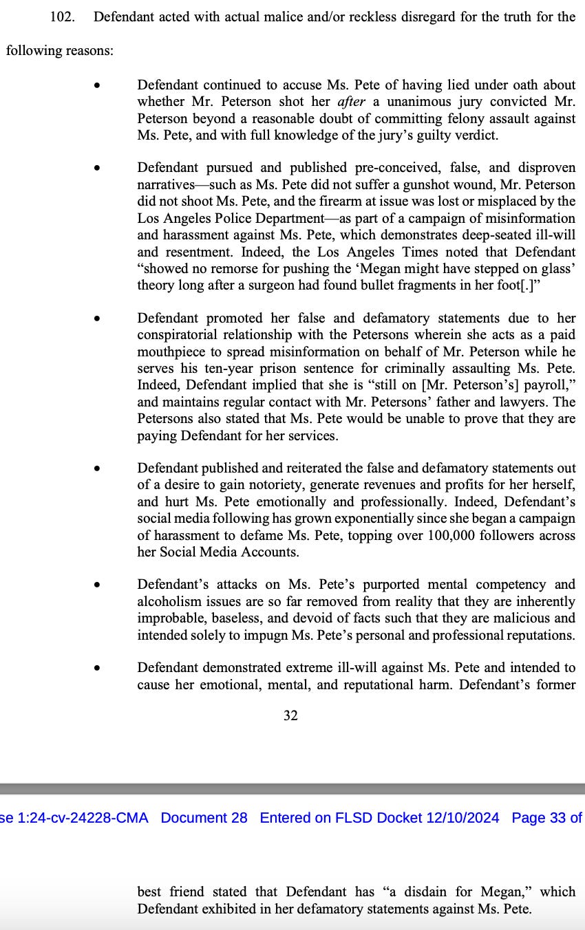 “In one phone call, the Petersons confidently asserted that Ms. Pete would be unable to prove that Mr. Peterson paid Defendant for attacking Ms. Pete,” Megan’s lawyers wrote in an amended complaint filed Tuesday, referring to Megan’s legal name, Megan Pete.