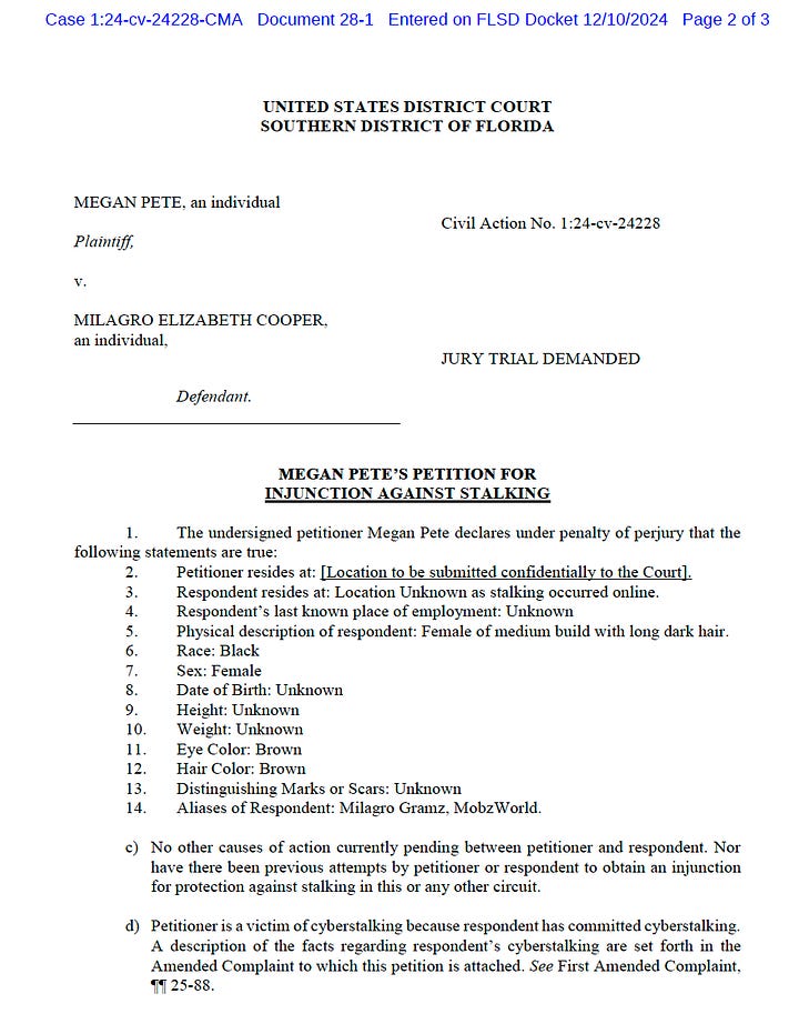 Pete also signed a petition for an injunction to prohibit Cooper “from committing any acts of stalking and providing any terms the court deems necessary for protection of a victim of stalking,” including possible law enforcement involvement.