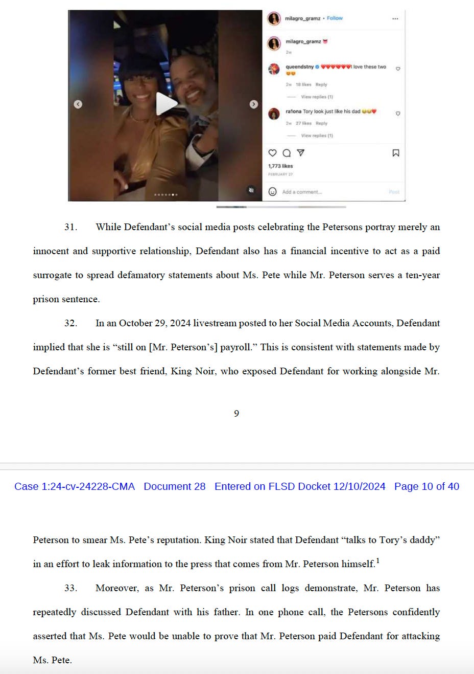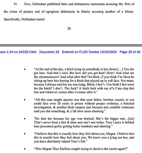 Much of the complaint focuses on Cooper’s statements online that Pete lied in her testimony and is falsely accusing Lanez of shooting her, as well as her statements that Pete is an alcoholic who is mentally incapacitated and may need a guardian.