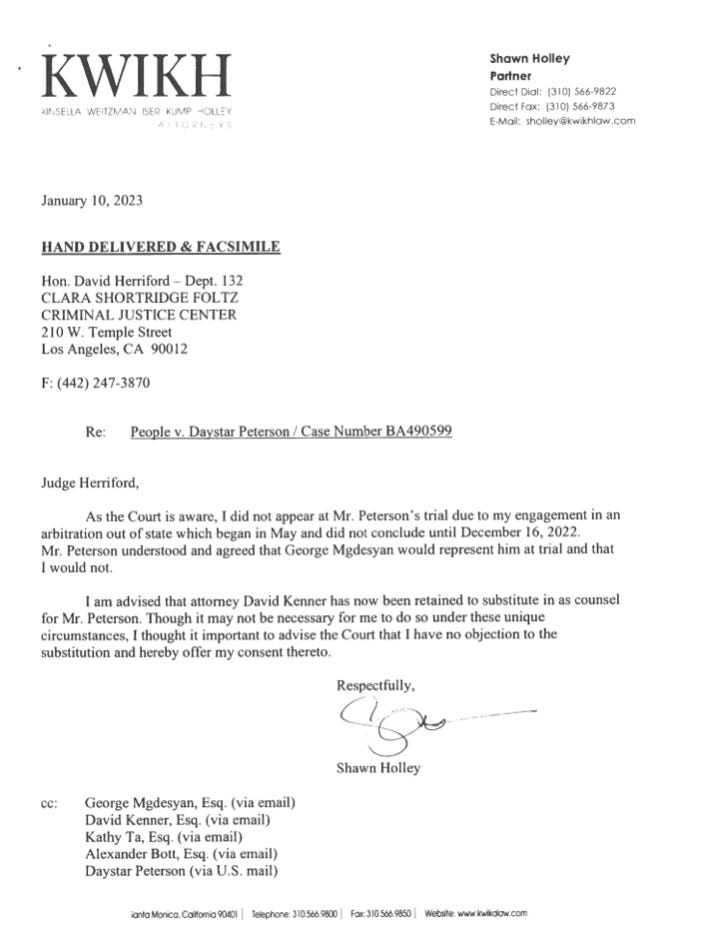 “As the Court is aware, I did not appear at Mr. Peterson’s trial due to my engagement in an arbitration out of state which began in May and did not conclude until December 16, 2022,” Holley wrote, referring to Lanez’s legal name, Daystar Peterson. “Mr. Peterson understood and agreed that George Mgdesyan would represent him at trial and that I would not.”