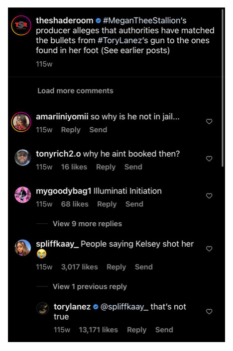 The comment was from Lanez’s verified account, and it said “that’s not true” in reply to someone saying people were alleging Harris fired the shots that injured Megan’s feet on July 12, 2020. Prosecutors didn’t disclose it to Lanez’s attorneys until Dec. 13, 2022, one day after the trial began, saying it was relevant because it contradict’s Lanez defense that Harris was the shooter.