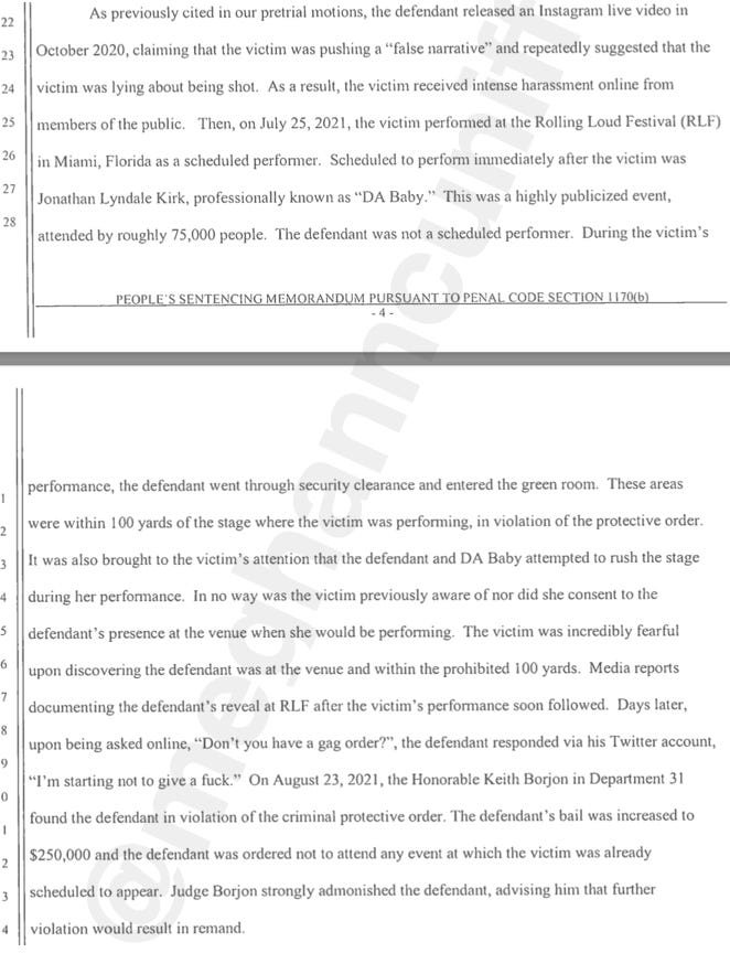 “During the victim’s performance, the defendant went through security clearance and entered the green room. These areas were within 100 yards of the stage where the victim was performing, in violation of the protective order. It was also brought to the victim’s attention that the defendant and DA Baby attempted to rush the stage during her performance. In no way was the victim previously aware of nor did she consent to the defendant’s presence at the venue when she would be performing. The victim was incredibly fearful upon discovering the defendant was at the venue and within the prohibited 100 yards. … Days later, upon being asked online, ‘Don’t you have a gag order?’, the defendant responded via his Twitter account, ‘I’m starting to not give a fuck.’”