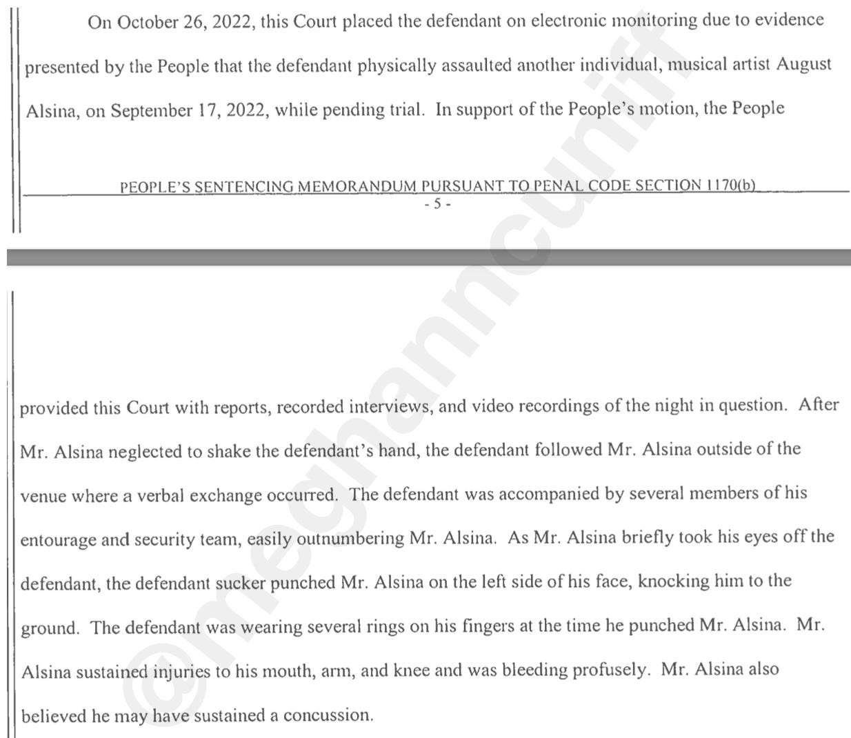 “After Mr. Alsina neglected to shake the defendant’s hand, the defendant followed Mr. Alsina outside of the venue where a verbal exchange occurred. The defendant was accompanied by several members of his entourage and security team, easily out numbering Mr. Alsina. As Mr. Alsina briefly took his eyes off the defendant, the defendant sucker punched Mr. Alsina on the left side of his face, knocking him to the ground. The defendant was wearing several rings on his fingers at the time he punched Mr. Alsina. Mr. Alsina sustained injuries to his mouth, arm, and knee and was bleeding profusely. Mr. Alsina also believed he may have sustained a concussion.”