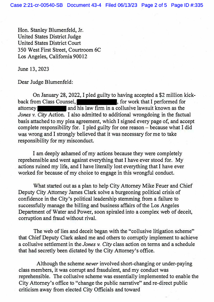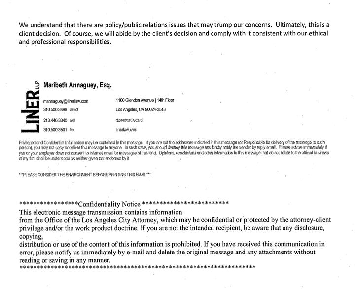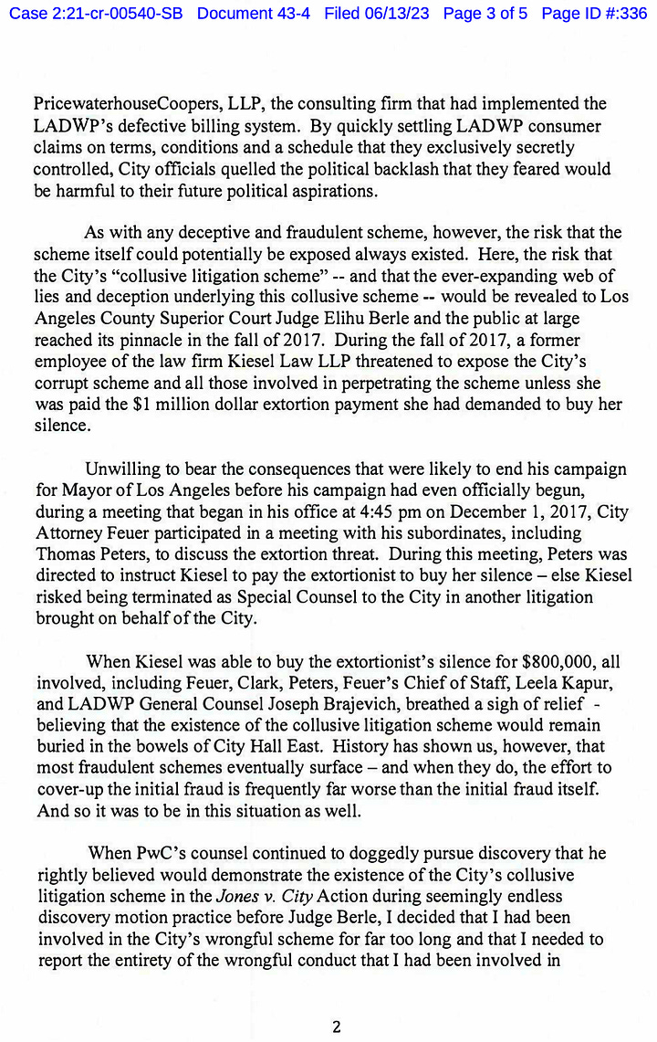 “Unwilling to bear the consequences that were likely to end his campaign for Mayor of Los Angeles before his campaign had even officially begun, during a meeting that began in his office at 4:45 pm on December 1, 2017, City Attorney Feuer participated in a meeting with his subordinates, including Thomas Peters, to discuss the extortion threat. During this meeting, Peters was directed to instruct Kiesel to pay the extortionist to buy her silence - else Kiesel risked being terminated as Special Counsel to the City in another litigation brought on behalf of the City.”