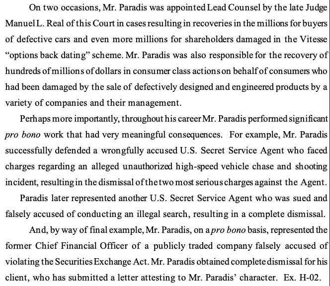 “Based on academic achievement and work experience, Mr. Paradis was recruited by multiple Wall Street law firms, but chose to become a plaintiffs’ attorney because he wanted to protect those incapable of protecting themselves,” according to the memo.