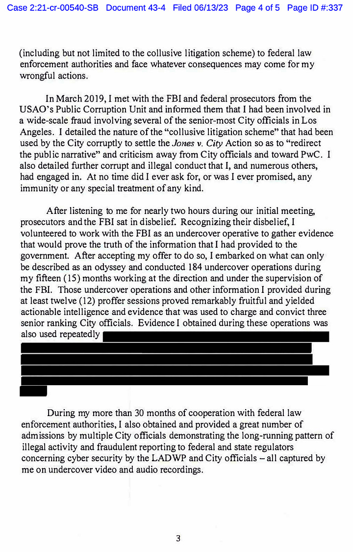 There was the $2.175 million kickback bribe for the sham lawsuit that was created to squelch potential public scrutiny about a scandal over DWP’s over-billing practices. Then there was a bribe that involved Paradis ghostwriting reports for a special monitor that positioned his cyber-services company, Aventador Utility Solutions, for a three-year, $30 million contract with DWP, and there was Paradis’ bribe of a DWP board member with free legal services in exchange for the member supporting his contract. Paradis also promised to make the DWP general manager Aventador’s future CEO and give him a $1 million annual salary and luxury car.
