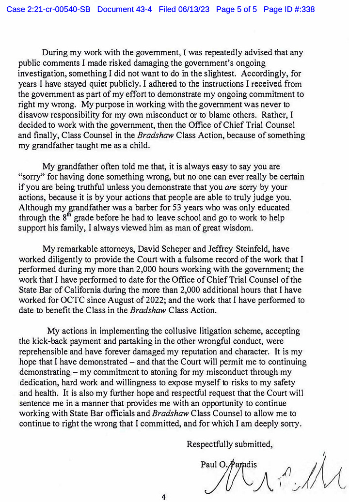 “There’s no excuse or any excuses. What I did was wrong. And I accept responsibility,” Paradis said. He explained plea negotiations with the U.S. Department of Justice that he said promised him a charge with less prison time than he actually got. He also told Blumenfeld of being appointed lead counsel by the now-late U.S. District Judge Manny Real on a group of cases, and being approached by opposing counsel seeking mercy for his clients.