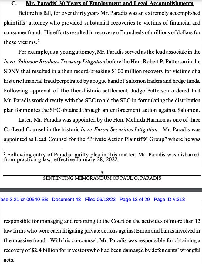 A graduate of New York Law School, Paradis owned the Paradis Law Group in Manhattan, but the U.S. Attorney’s Office says he lives in Scottsdale, Arizona. According to his sentencing memo, he worked on the New York Law School Law Review while attending night school and working days on Wall Street as a portfolio manager.