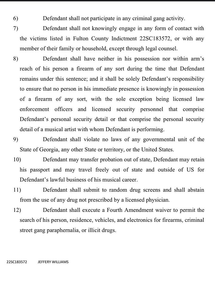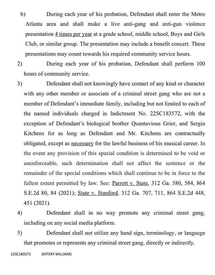 Williams’ probation prohibits him from contacting gang members and other defendants named in the 65-count indictment. That incudes rapper Sergio “Gunna” Kitchens, who has performed with Williams and recorded songs with him, but Whitaker provided an exception “as absolutely necessary to conduct the lawful business of your musical career.”