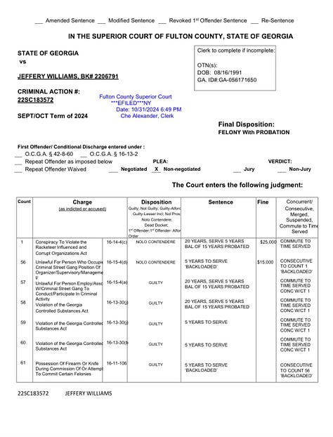 Over the objection of prosecutors, Whitaker on Thursday allowed Williams to plead no contest to leading criminal street gang activity and conspiracy to violate Georgia’s anti-racketeering law. She said she only did so because he pleaded guilty to a gang crime. He also pleaded guilty to three counts of violating Georgia’s controlled substances act, one count of possession of a firearm during a felony and one count of possession of a machine gun.