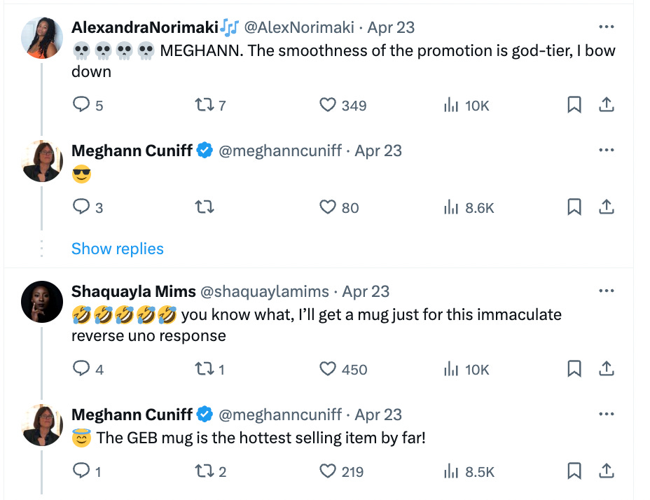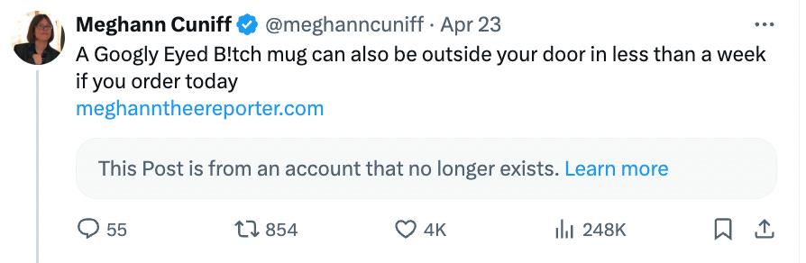 One positive result of all the hooplah is I sold some merch off it. I quote tweeted a couple haters and plugged my Shopify store, and I sold 12 Googly Eyed B!tch mugs, one Meghann Thee Reporter mug and one GEB sweatshirt in 24 hours. You can order yours here.