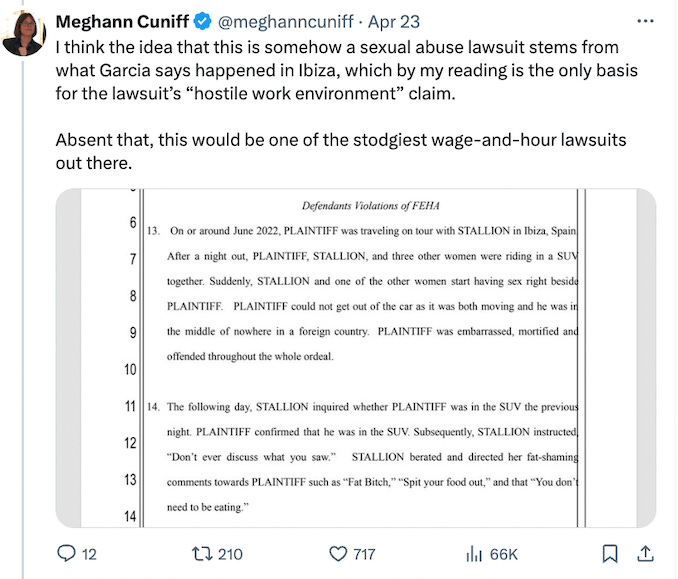 Surprisingly, after a mountain of salacious details in the Lizzo lawsuit, Garcia’s lawsuit offers no specifics. As someone in my Twitter replies asked, “What is the threshold for sex in this case?”