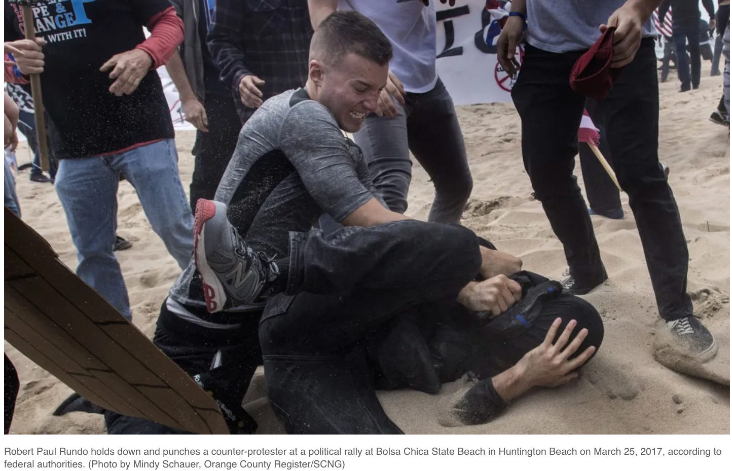The indictment cited attacks at rallies in Huntington Beach on March 25, 2017; in Berkeley on April 15, 2017; and in San Bernardino on June 10, 2017. A U.S. Attorney’s Office press release said the men recruited members and coordinated “hand-to-hand and other combat training, traveling to political rallies to attack protesters and other persons, and publishing photographs and videos of violent acts to recruit other members for future events.”