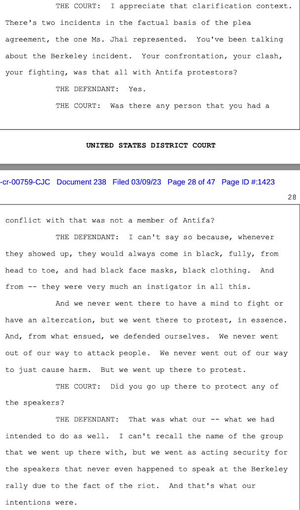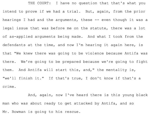 “I vividly recall seeing — I don’t know whether it was the Huntington Beach or the Berkeley rally. And I recall a veteran in a wheelchair being — water or drinks or beverages were thrown at him. I remember an elderly woman being cut because Antifa was throwing stuff at her. I recall seeing certain speakers, because of their political views, were being shut down by Antifa,” the judge said.