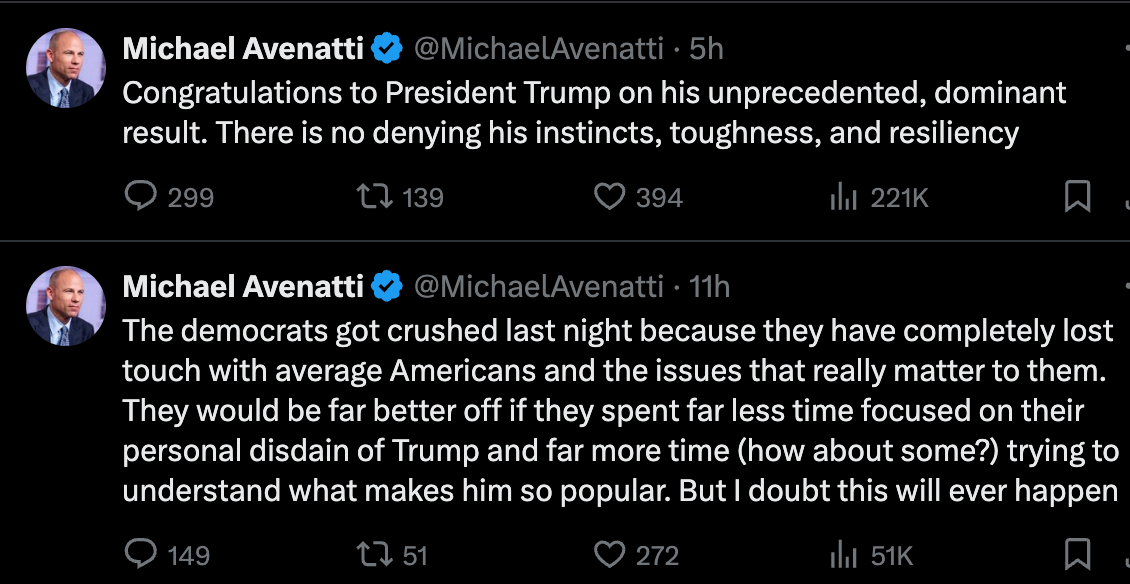 Former California lawyer and imprisoned federal felon Michael Avenatti congratulated Trump on Wednesday in a post on the social media platform X, formerly known as Twitter.