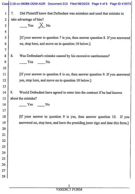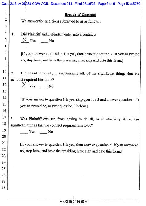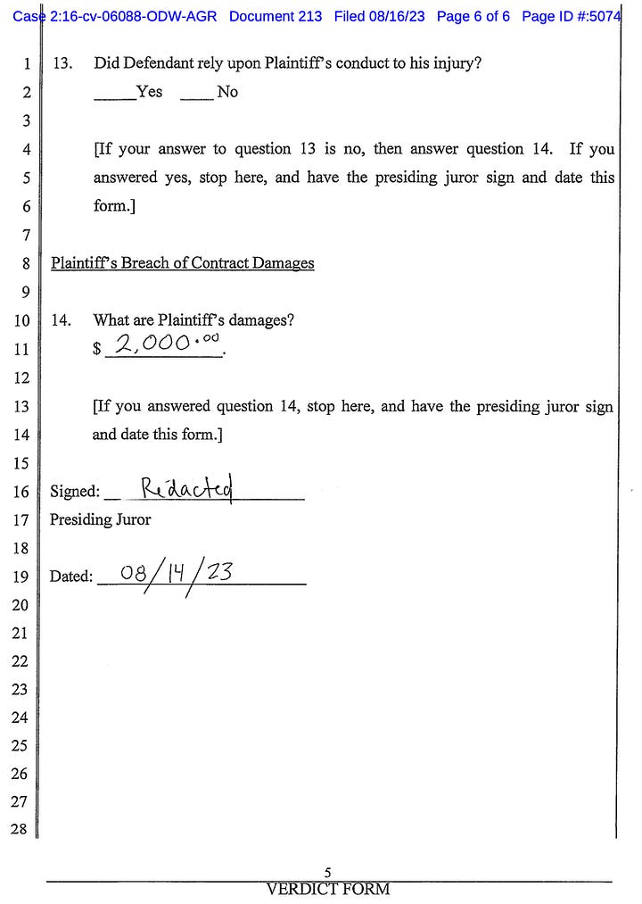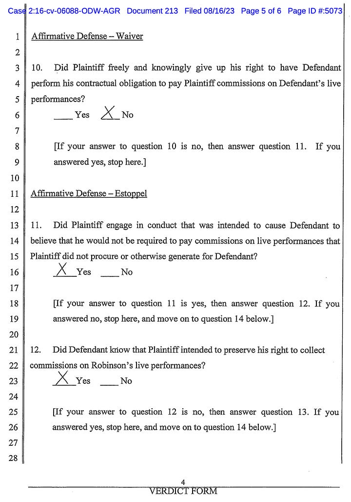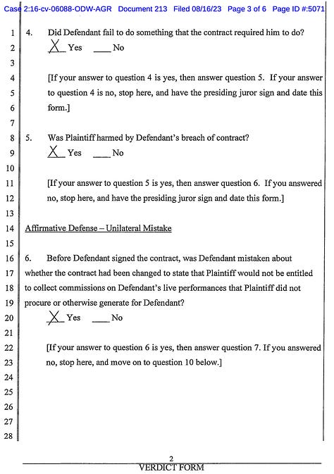 One of two jurors who spoke with attorneys after the verdict said the verdict form led to a circular argument in the jury room. The juror didn’t expand, but the question about affirmative defenses applying to the $2,000 indicates jurors saw it as a separate legal issue from the $940,300 in live performance commissions but were forced to address both issues at the same time because the verdict form didn’t distinguish them.
