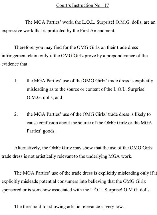 The instruction told jurors that the dolls “are an expressive work that is protected by the First Amendment” and for T.I. and Tiny to prevail, they needed to establish that the dolls’ use of the OMG trade dress was “explicitly misleading” and “likely to cause confusion.” Alternatively, they could show that the dolls’ use of the OMG Girlz trade dress was not artistically relevant or that it “explicitly misleads” people into believing the OMG Girlz are officially associated with the dolls.