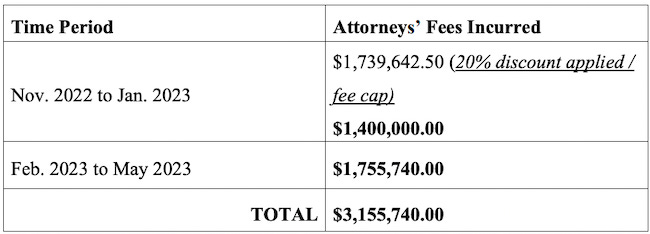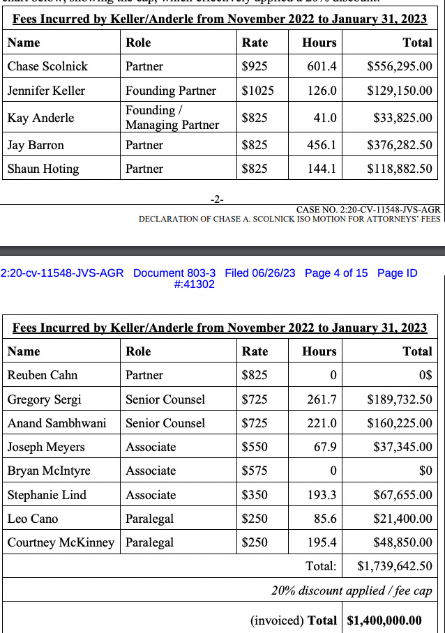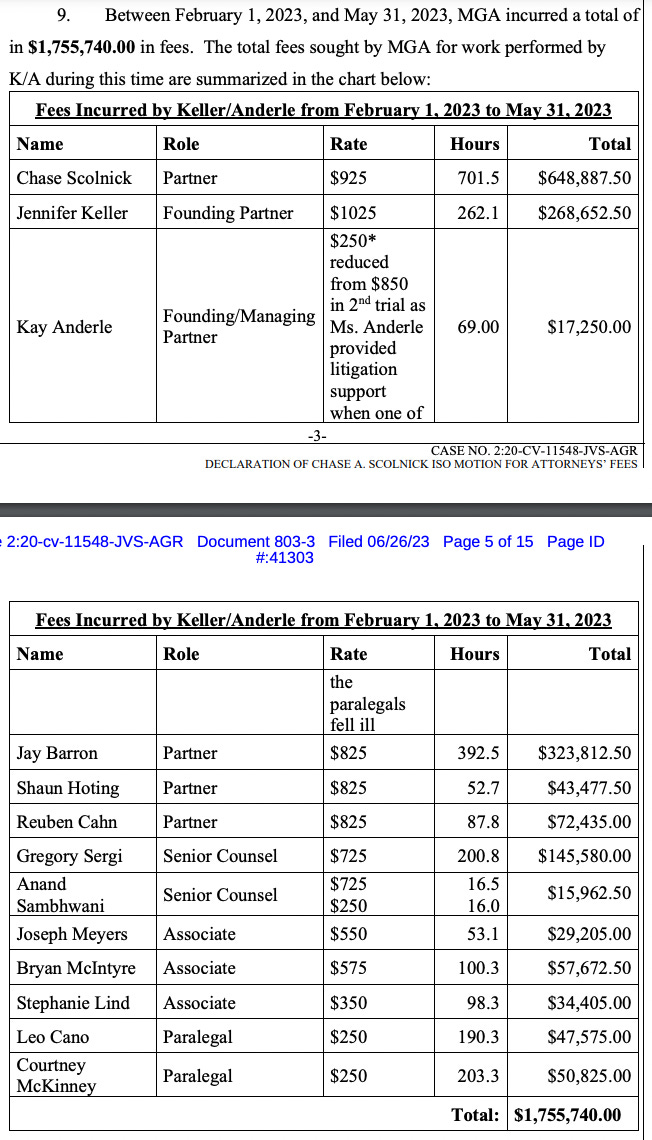 The new trial moots MGA’s request that T.I. and Tiny pay nearly $6.2 million to cover the company’s attorney fees. Keller’s and Scolnick’s firm, Keller/Anderle LLP, charged nearly $3.2 million for pre-trial work and the two trials. Their motion for attorney fees includes hourly rates between $250 for paralegals and $825 to $1,025 for partners, as detailed below.