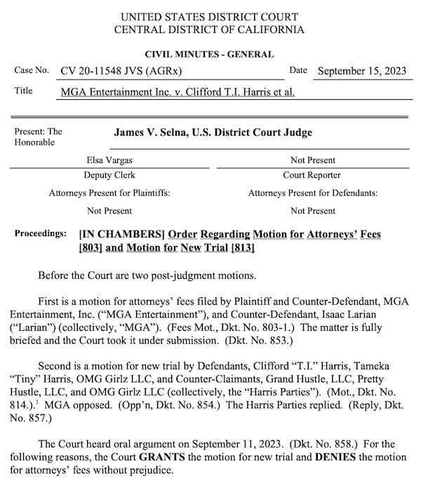 Had the Supreme Court ruled before the jury was instructed, T.I.’s and Tiny’s lawyers could have been blamed for allowing the erroneous instruction, and the verdict would stand. But the ruling was issued on June 8, two weeks after the jury swiftly rejected their request for $98 million to $333 million from MGA’s doll profits. Senior U.S. District Judge James Selna concluded on Friday that the situation warrants a new trial with a correct jury instruction.