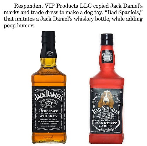 But at the same time, a high-stakes Supreme Court showdown was taking shape over a $15 dog toy called Bad Spaniels that lawyers for Jack Daniel’s argued “imitated a Jack Daniels’ whiskey bottle, while adding poop humor.”