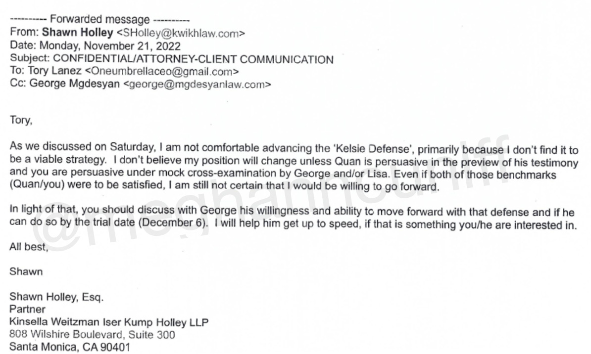“As we discussed on Saturday, I am not comfortable advancing the ‘Kelsie Defense’ , primarily because I don’t find it to be a viable strategy,” Holley wrote Lanez on Nov. 21, 2022, misspelling the first name of Megan’s former friend and assistant, Kelsey Nicole Harris.