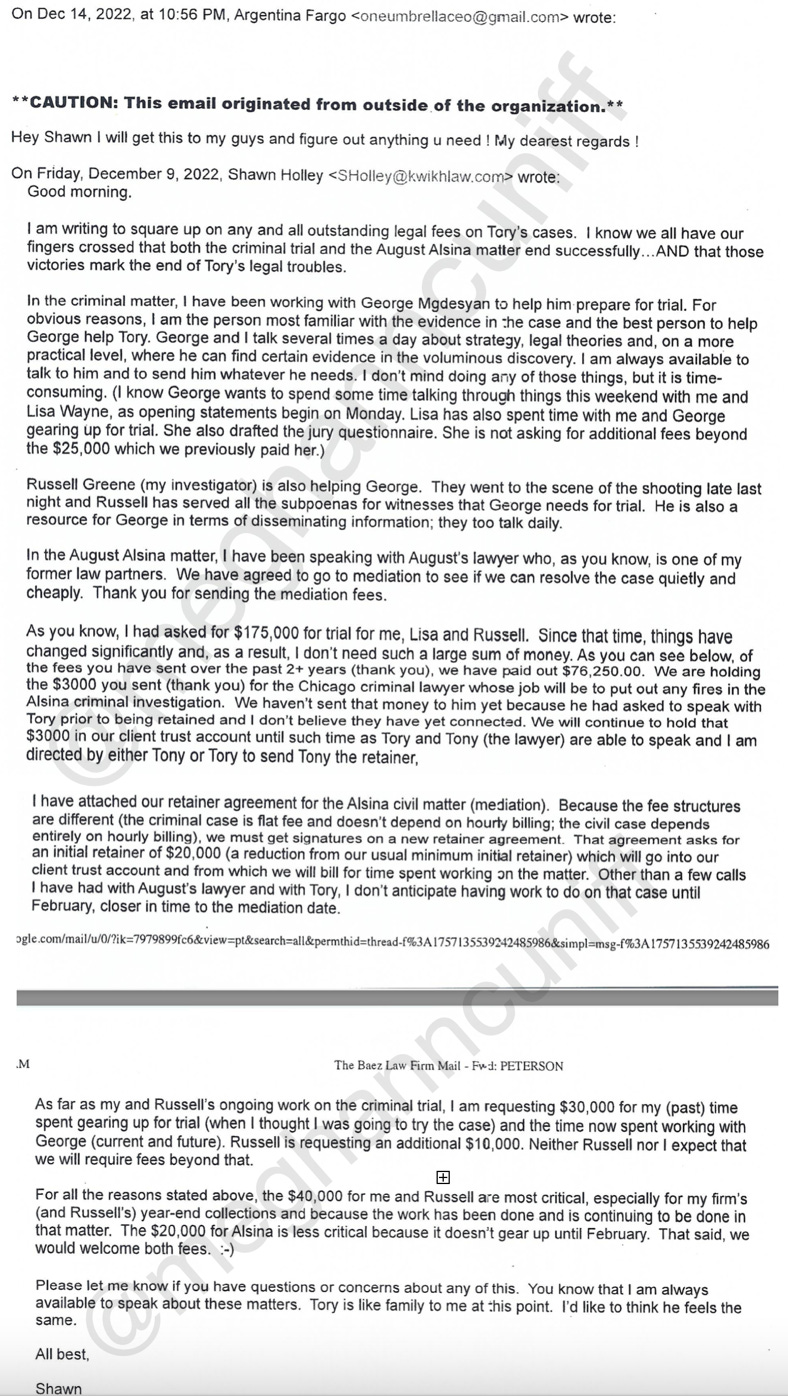 Great reporting! No idea what Holley's strategy was going to be but it HAD to be better than Mgdesyan, Barhoma, & Baez. The latter three have caused Tory to "shoot himself in the foot" multiple times (pun not intended, just the best description after Kelsey's September 2022 testimony was played in court & now this email correspondence has been released publicly).