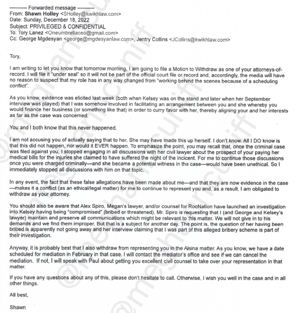 The next line, however, indicates something else was afoot. Holley told Lanez that Megan’s lawyer Alex Spiro is investigating “Kelsey having being ‘compromised’ (bribed or threatened)” and has requested she and other attorneys “preserve all communications which might be relevant to this matter.”