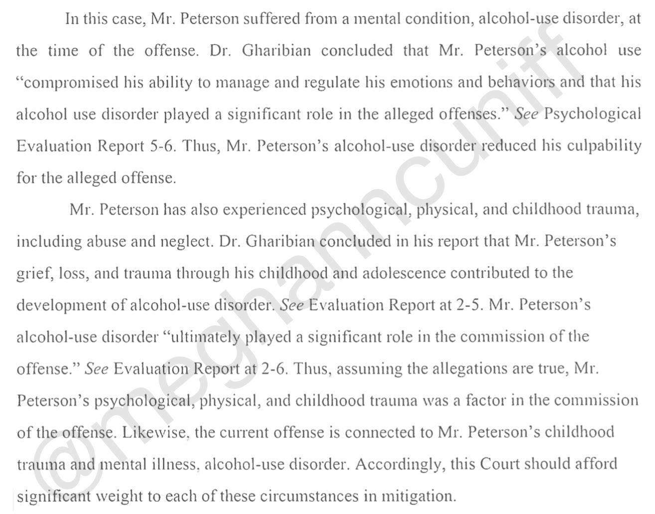 “Dr. Gharibian is not able to determine guilty or innocence in this case or to verify Mr. Peterson’s version of events,” according to the memo. “Dr. Gharibian, however, has made several key findings which show that, assuming that the allegations in this case are true, Mr. Peterson’s childhood trauma and alcohol-use disorder were contributing factors in the offense.”