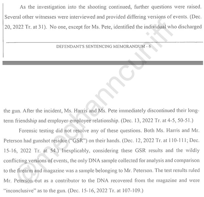 “Forensic testing did not resolve any of these questions,” the memo continues. “Inexplicably, considering these GSR results and the wildly conflicting versions of events, the only DNA sample collected for analysis and comparison to the firearm and magazine was a sample belonging to Mr. Peterson. The test results ruled Mr. Peterson out as a contributor to the DNA recovered from the magazine and were ‘inconclusive’ as to the gun.”