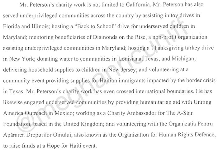 “Mr. Peterson has a history of prosocial conduct and behavior, including active involvement in charitable and community organizations serving underprivileged communities,” according to the memo.