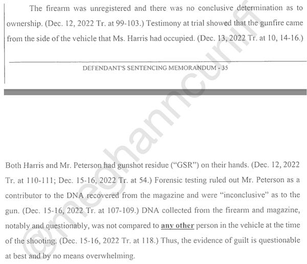 “The defense posed a plausible explanation for the jail call and text message — that Mr. Peterson was apologizing for the argument in the car before the shooting for having a sexual relationship with both Ms. Harris and Ms. Pete,” according to the memo, referring to Megan’s legal name, Megan Pete.
