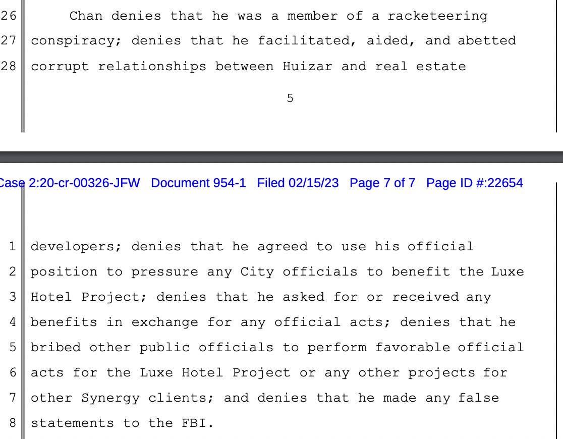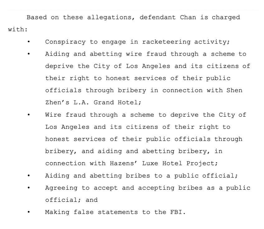 “The government alleges that, after he left the City and became a private consultant, defendant Chan continued to further the goals of the racketeering conspiracy by seeking to bribe other public officials, including Huizar’s Planning Director, to perform favorable official acts for the Luxe Hotel Project and projects for other Synergy clients, including through indirect financial payments to the public officials’ relatives,” Judge Walter wrote.