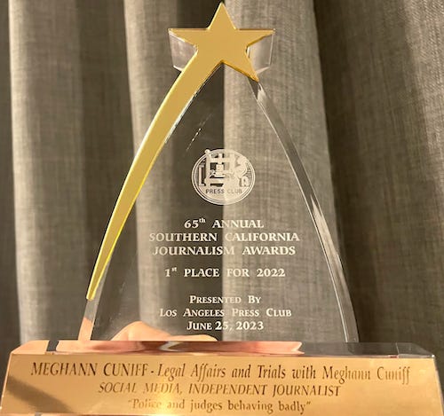 1st 🥇 went to my Twitter thread about the Los Angeles federal judiciary’s handling of a civil rights lawsuit from a man who was wrongfully imprisoned of murder. I was proud to see my name, “Legal Affairs and Trials with Meghann Cuniff” and “Police and judges behaving badly” together on the ballroom big screen.