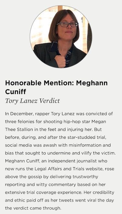 “In December, rapper Tory Lanez was convicted of three felonies for shooting hip-hop star Megan Thee Stallion in the feet and injuring her. But before, during, and after the star-studded trial, social media was awash with misinformation and bias that sought to undermine and vilify the victim. Meghann Cuniff, an independent journalist who now runs the Legal Affairs and Trials website, rose above the gossip by delivering trustworthy reporting and witty commentary based on her extensive trial coverage experience. Her credibility and ethic paid off as her tweets went viral the day the verdict came through.” - Judge Kat Tenbarge, NBC News’ tech and culture reporter