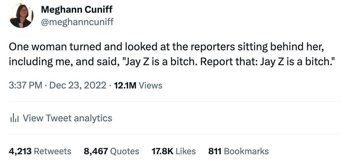 It contains what I’m sure will always be my greatest tweet: the “Jay Z is a bitch” tweet. There are many reasons it is a great courtroom tweet, foremost being that it exemplifies reporting something not for the truth of the matter but to establish state of mind.