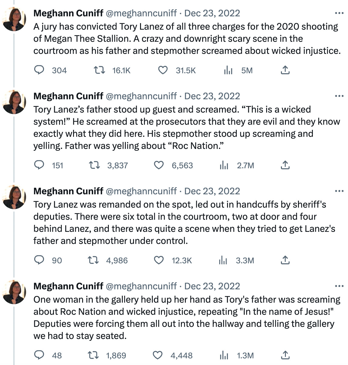 The most recent honor came Tuesday when I received honorable mention for “best news-based Twitter thread” in New York University’s American Journalism Online Awards for my coverage of verdict day in Tory Lanez’s trial for shooting Megan Thee Stallion.