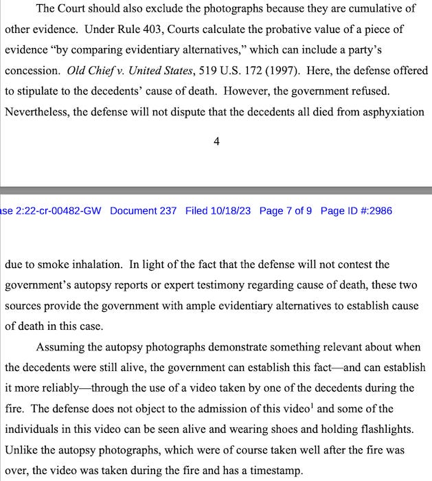 “It is unclear what relevancy these photographs and videos could possibly have to the trial. The government does not need to prove that the decedents were unaware they would die in a fire,” the motion said. “It does not need to prove that they were happy people, people who celebrated birthdays, people who liked ice cream.”