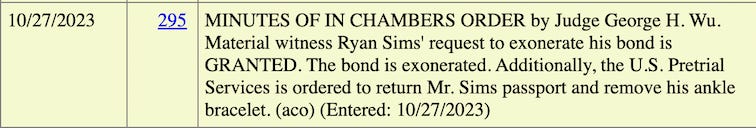 The filings are sealed, but Judge Wu on Friday granted “material witness Ryan Sims’ request to exonerate his bond” and ordered U.S. Pretrial Services “to return Mr. Sims’ passport and remove his ankle bracelet.”