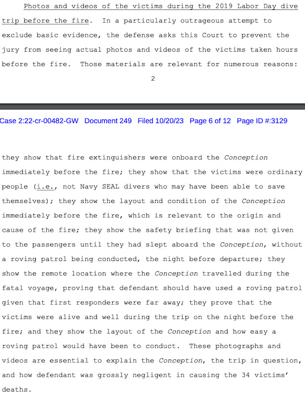 Prosecutors called the request “a particularly outrageous attempt to exclude basic evidence.” The photos “prove that the victims were alive and well during the trip on the night before the fire; and they show the layout of the Conception and how easy a roving patrol would have been to conduct.”