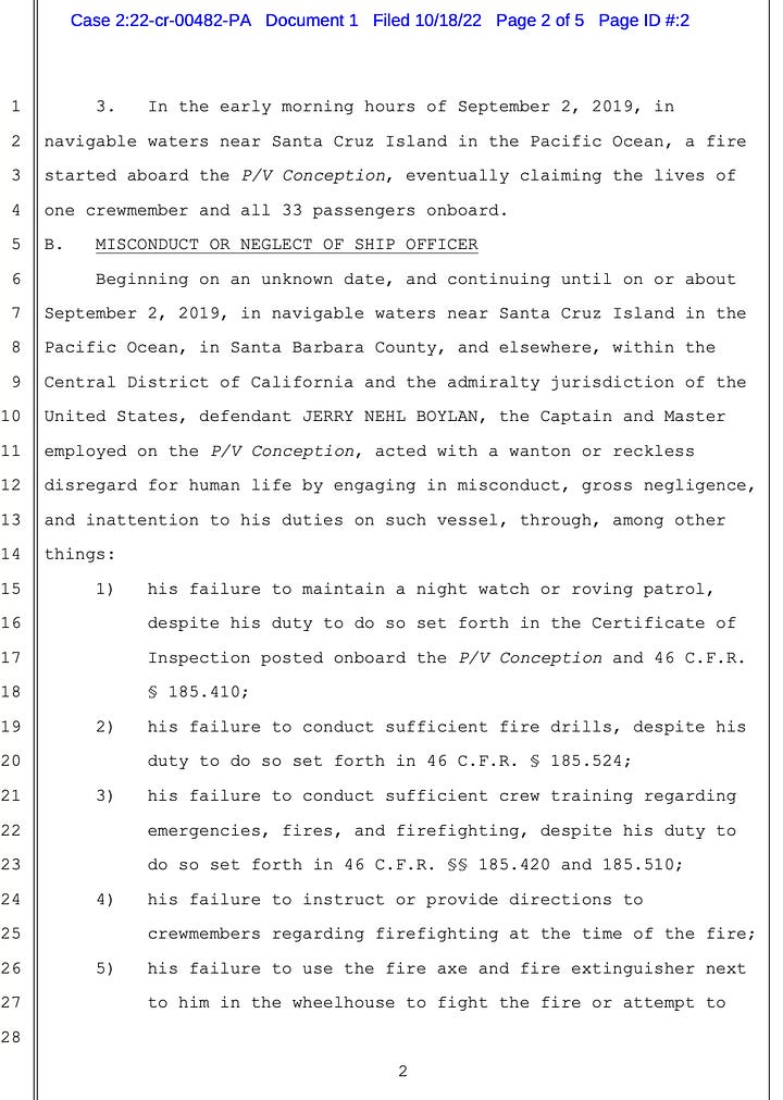 The boat was anchored at Platts Harbor on the north side of Santa Cruz Island when the fire broke out. Boylan had been sleeping on an upper deck and was the first to jump overboard, followed by four crew members. Prosecutors say Boylan didn’t train his crew how to fight fires, didn’t maintain a night patrol as legally required and didn’t try to fight the fire or rescue the victims before he jumped overboard. They also say he should have known that it could take an hour for the U.S. Coast Guard to arrive at the harbor when he called for help before jumping overboard.