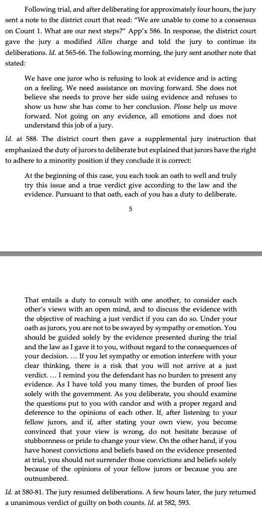 Avenatti also focused on the instructions Judge Furman read to jurors after they announced a deadlock four hours into deliberation, then later said a juror was refusing to deliberate. The instructions were Allen charges authorized under the 1896 U.S. Supreme Court decision in Allen v. United States that says a court can instruct deadlocked jurors to reexamine their views.