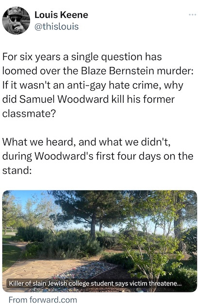 My friend Louis Keene of the Forward has been reporting on the trial of Samuel Woodward for the murder of Blaze Bernstein in Orange County, California, in 2018.