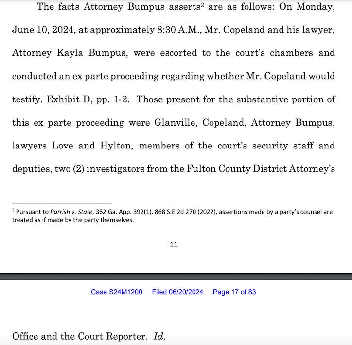 The discussion will continue on Monday, July 1, and possibly Tuesday, July 2, then on July 3 Glanville will conduct an “in camera review of Copeland’s ex parte matter,” which apparently refers to the transcript of the judge’s June 10 private meeting with prosecutors and Copeland about his initial refusal to testify, which led to his witness stand arrest for contempt of court and weekend jailing.