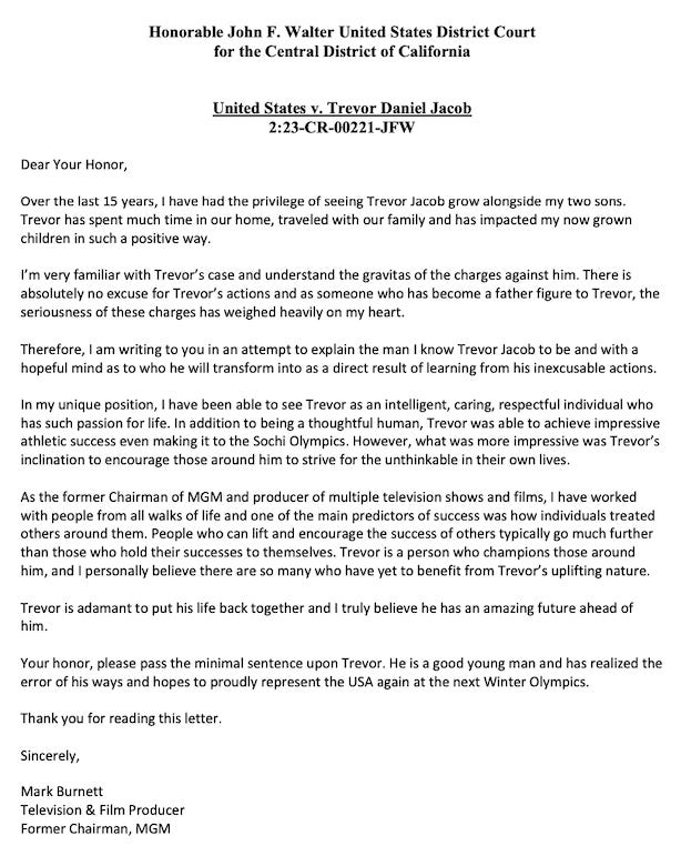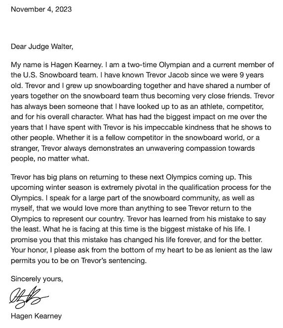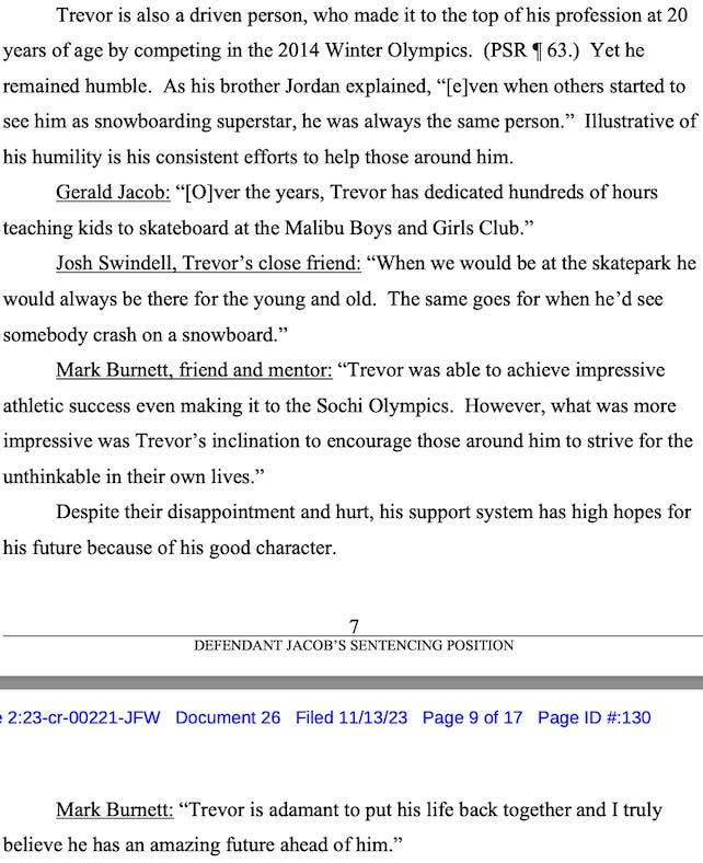 Several of Jacobs’ friends and family members wrote support letters for him, including his mother and father, his dentist, television producer Mark Burnett, the father of two of Jacob’s friends and the former chairman of MGM Worldwide Television Group; as well as Jacob’s friend and fellow professional snowboarder Hagen Kearney, a two-time Olympian.