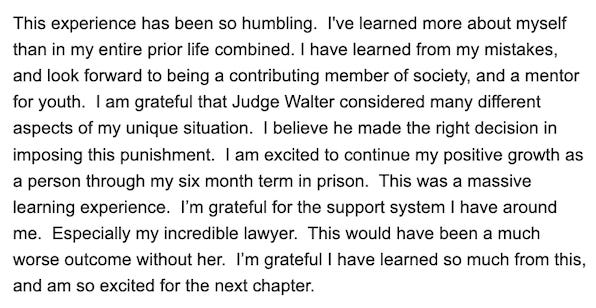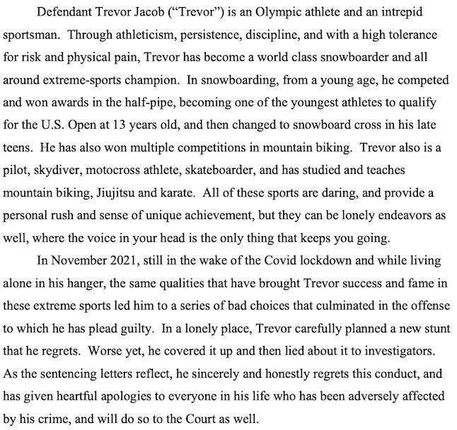 “In a lonely place, Trevor carefully planned a new stunt that he regrets. Worse yet, he covered it up and then lied about it to investigators. As the sentencing letters reflect, he sincerely and honestly regrets this conduct, and has given heartful apologies to everyone in his life who has been adversely affected by his crime, and will do so to the Court as well,” according to the defense memo.