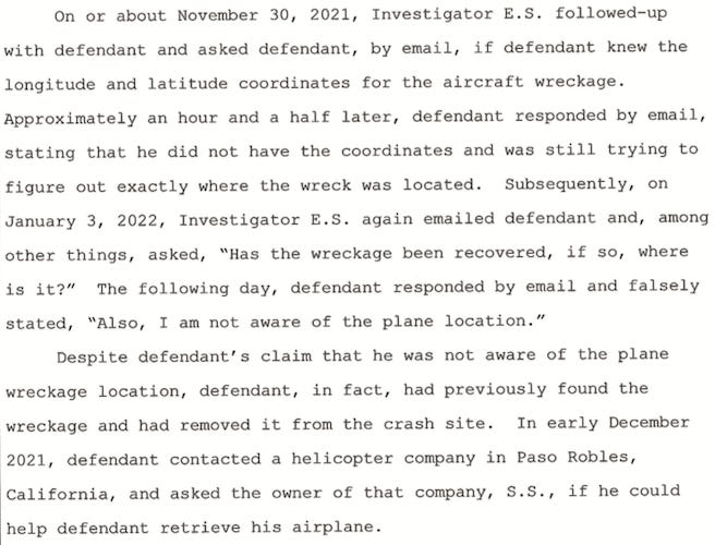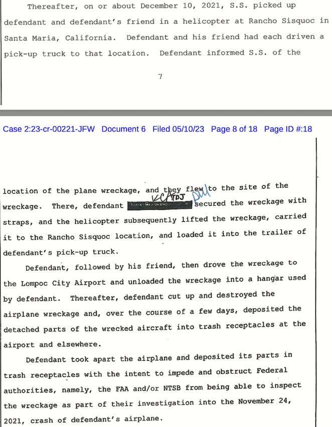 Jacob then lied to National Transportation Safety Board investigators about recovering the wreckage, which he also secretly destroyed, and falsely told them he didn’t know where the plane had crashed. In fact, he had reached the wreckage via helicopter and used a pick-up truck to take it back to the Lompoc airport, where Jacob cut it up and disposed of it in trash receptacle “and elsewhere,” according to the plea agreement.